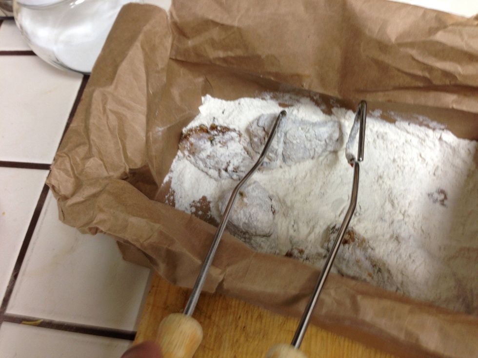 About 5 or 6 at a time. shake the bag and use a clap to shake the excess flour