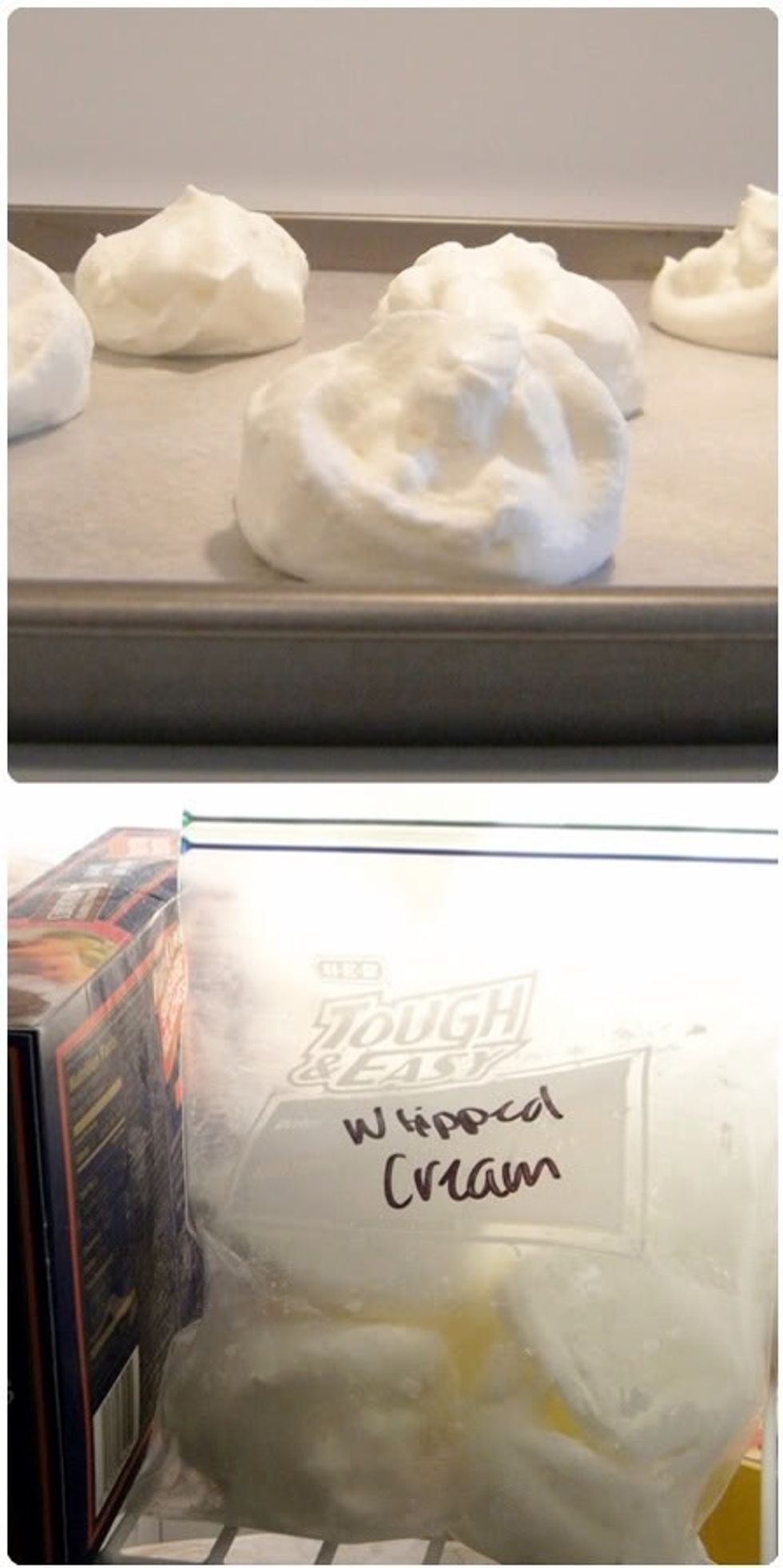 Line baking sheet with wax paper & spoon dollops on paper. Put in freezer until frozen. OR..... Use a can of whipped cream to spray swirled dollops onto waxed cookie sheet.