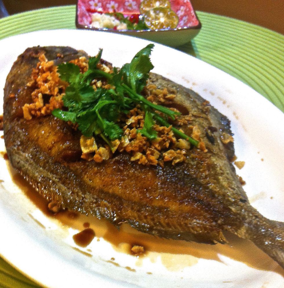 Transfer fish to serving plate. Top with golden fried garlic and drizzle with dark and light soy sauce. Add 1 tablespoon of garlic oil over it. Garnish with Chinese parsely.