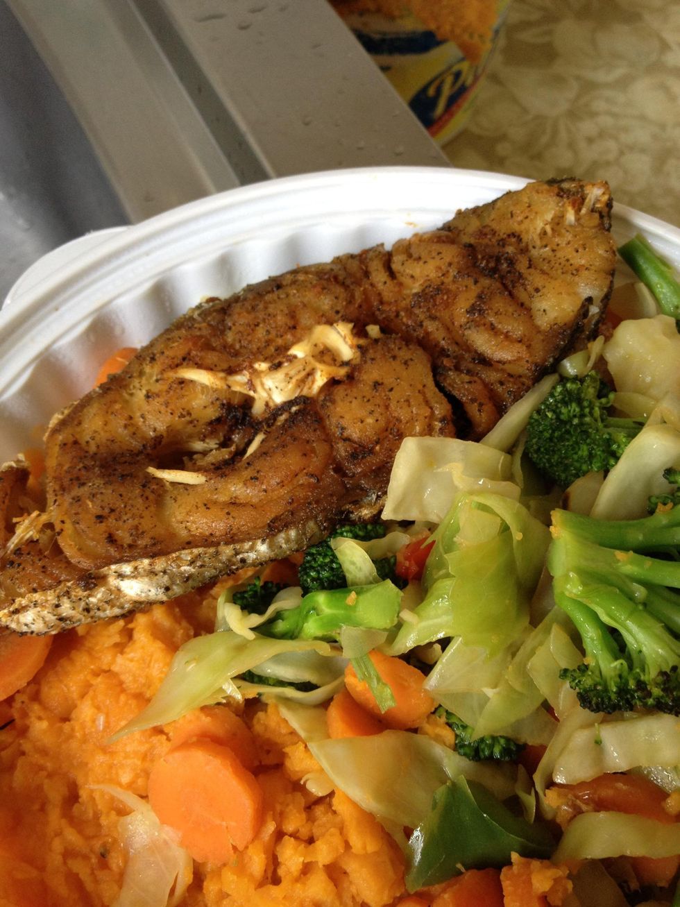In a separate container, combine cabbage, broccoli, onion, garlic, thyme, sweet peppers, small piece of hot peer, carrots and drizzle with small amount of oil.