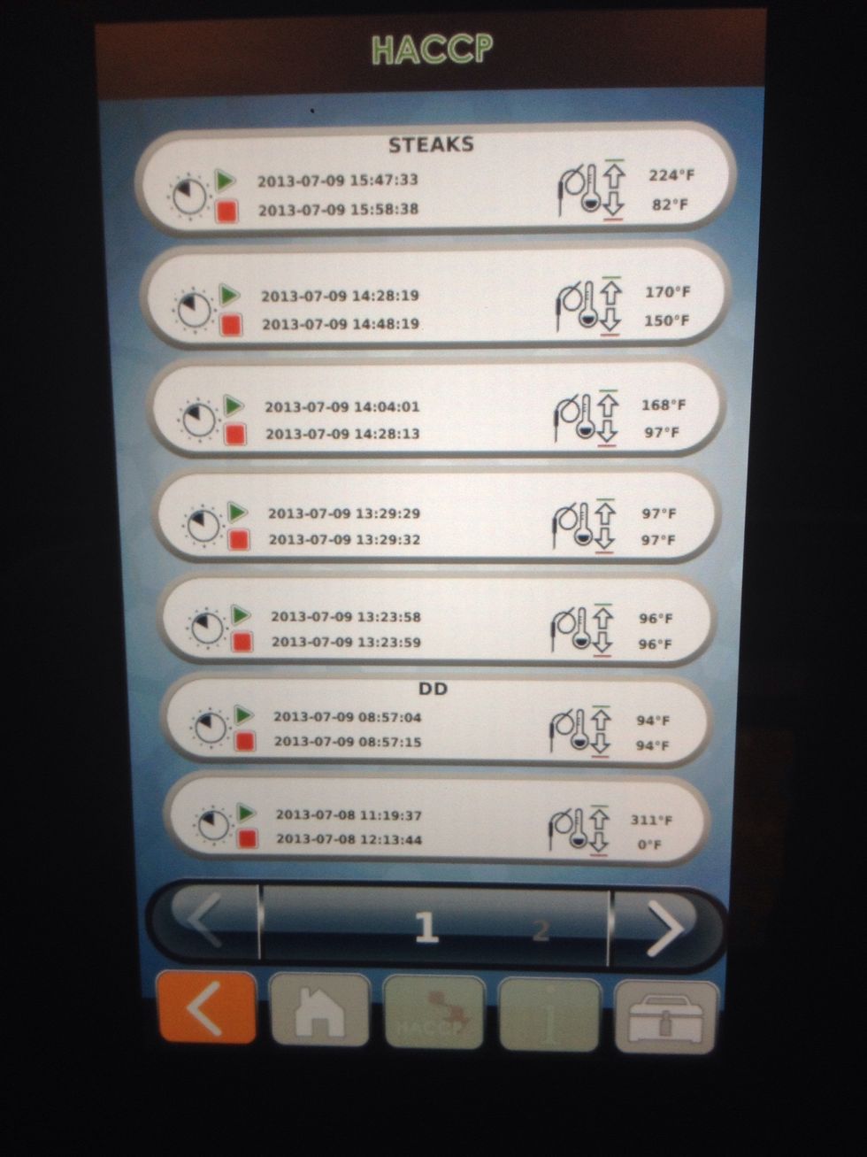 This screen shows recent cycles completed in the oven. Program name is displayed at the top, as well as low temp and high temp, and elapsed time. For more detailed info, download HACCP data to a drive