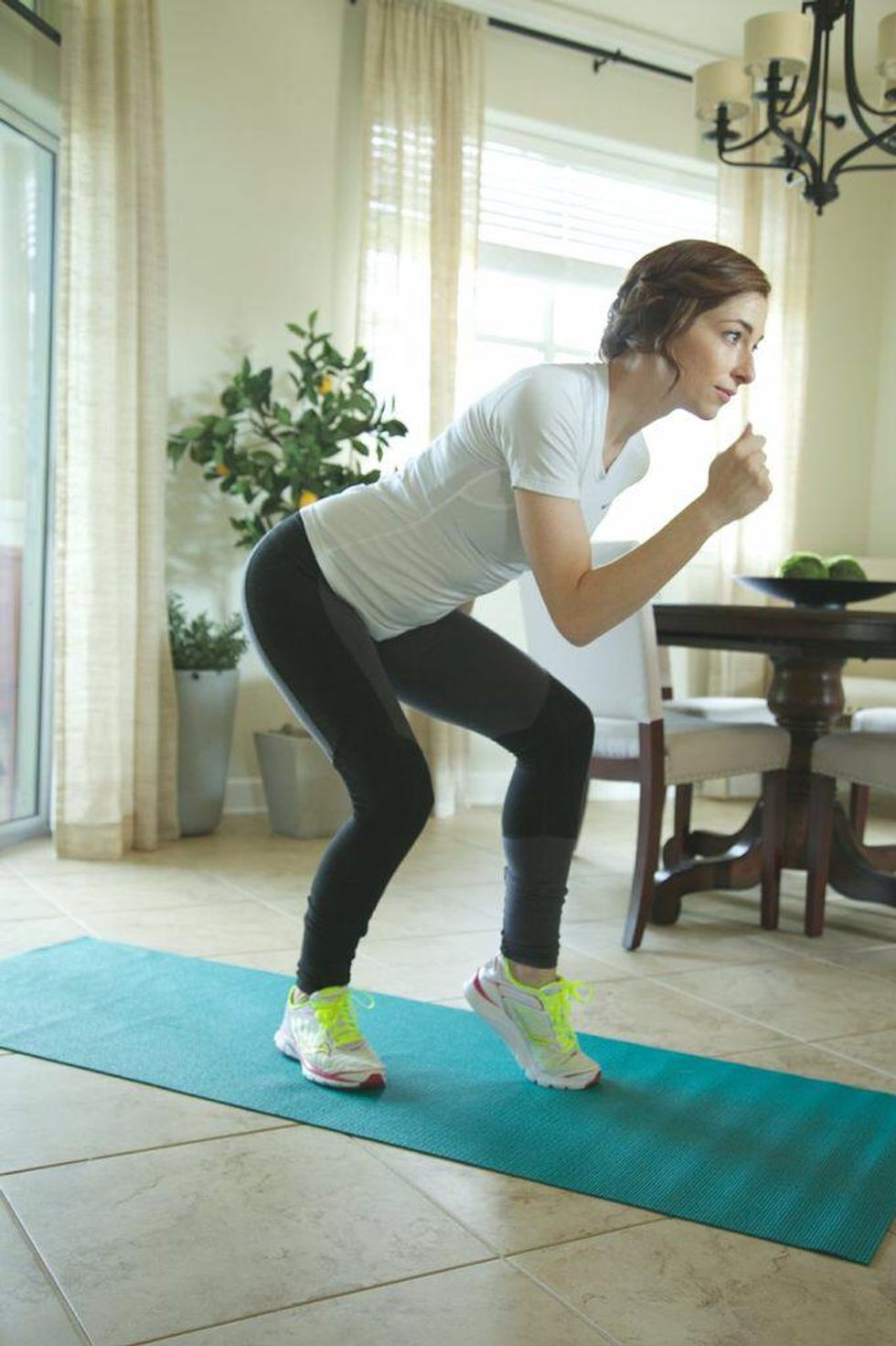 Squats: Stand with feet shoulder width apart. Bend the knees and lower the torso while keeping the bum out. Hold, then slowly rise back to starting. Continue for 1 minute.