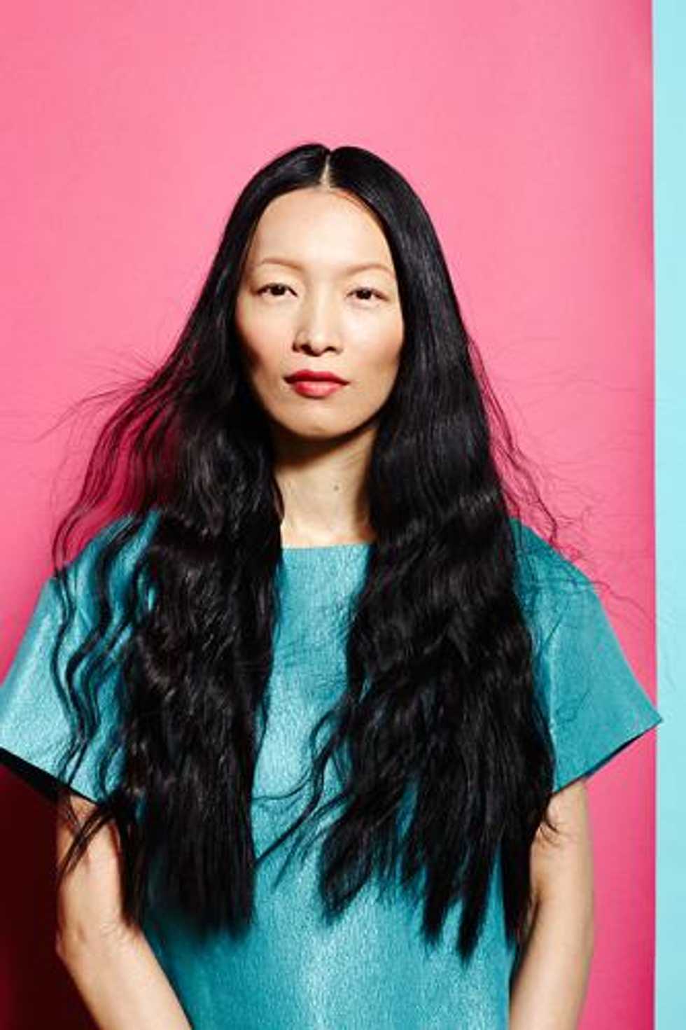 Blowdry your hair roughly, working in a prep product to give it some extra hold, such as Aveda's Pure Abundance Style Prep. Then, divide your hair into two even sections.