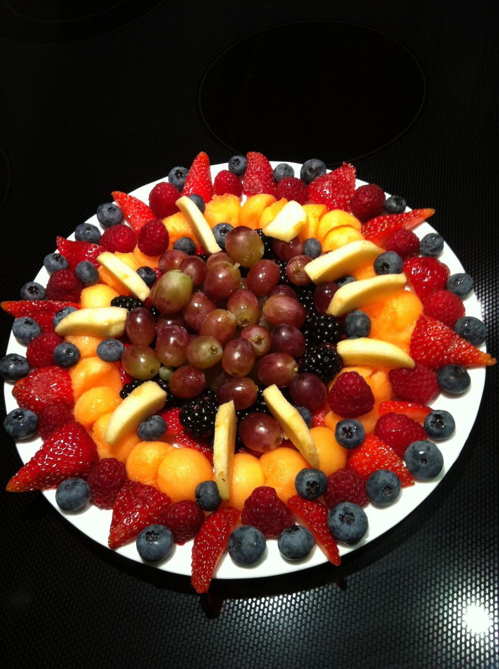 Simple arrangement I put together last night. Unfortunately, the photo's angle doesn't do it justice... I used pineapple top for the center and stuck strawberries and red grapes.