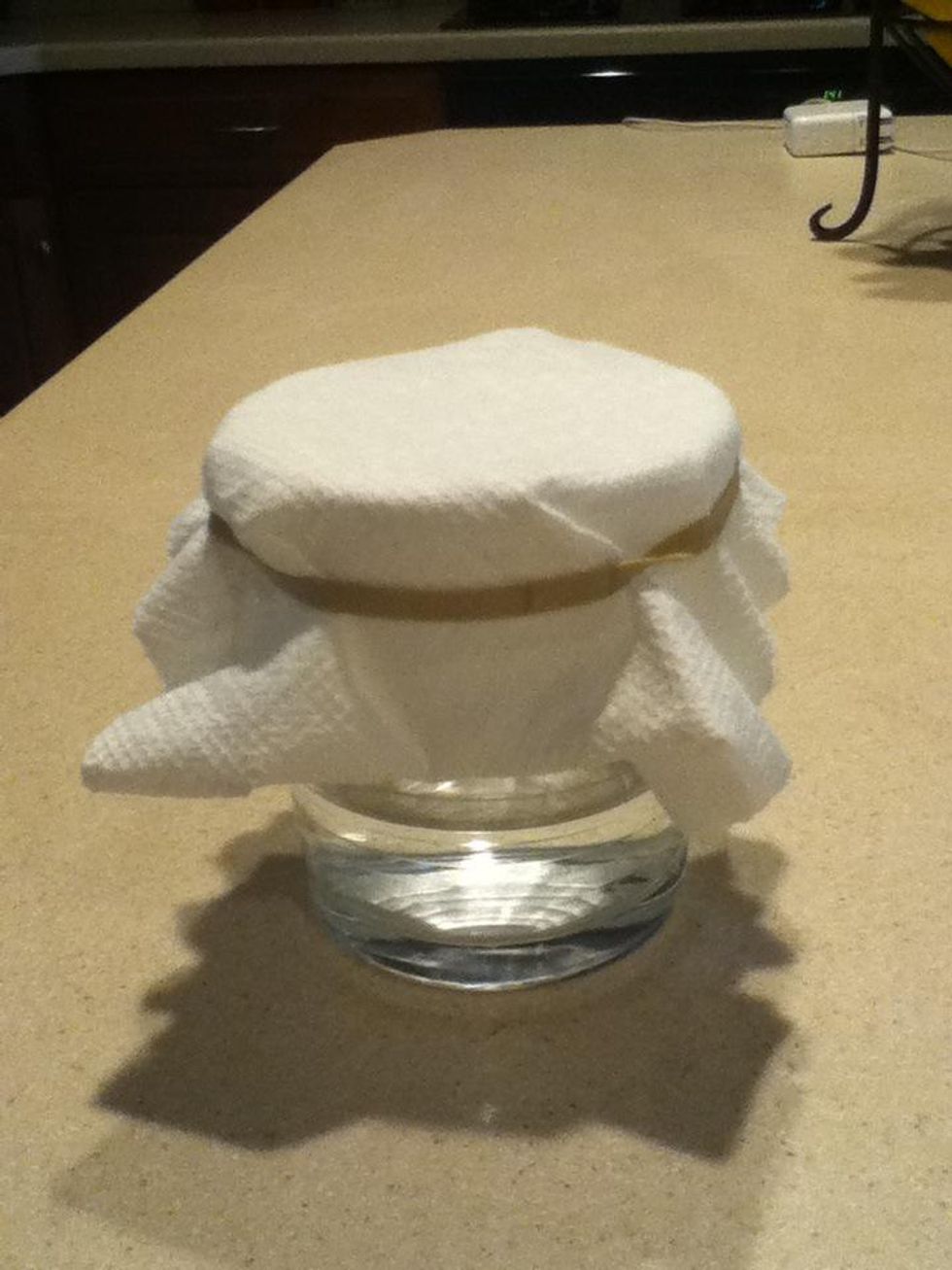 Here are your suppliesFill your glass with waterPut paper towels over glass If you want to you can use a rubber band