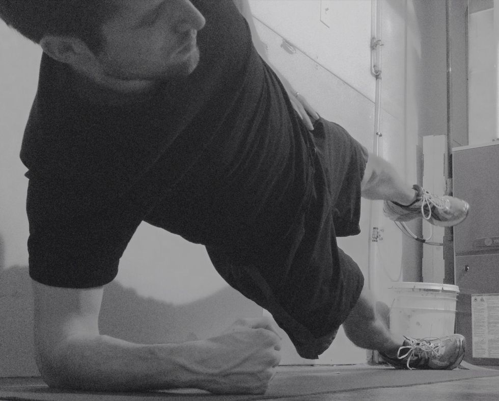 Side plank for 45 seconds each side. Rest on the elbow and forearm. Feet stacked. Keep hips forward. Heroic: Raise the uppermost leg. Legendary: Side hand balance with leg raise.