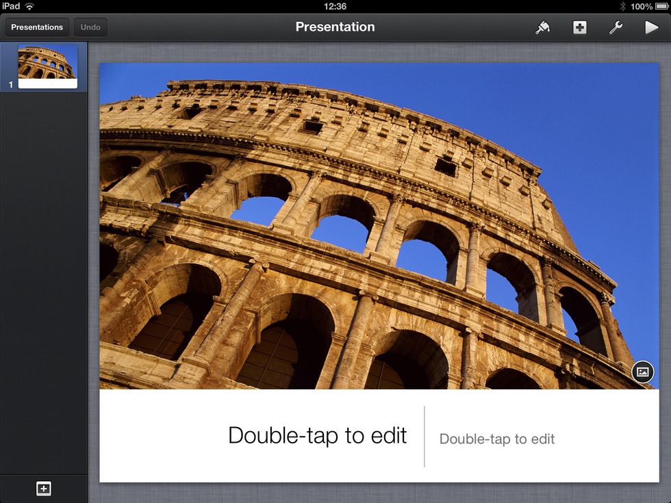 That's it. If you want to see how your presentation looks like in Presentation View just tap the play icon (the little triangle) on the top right and it will start playing full screen.