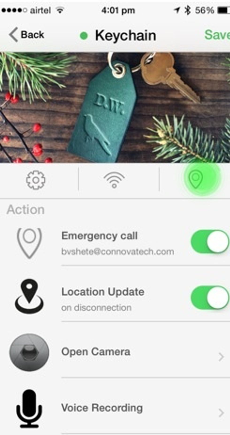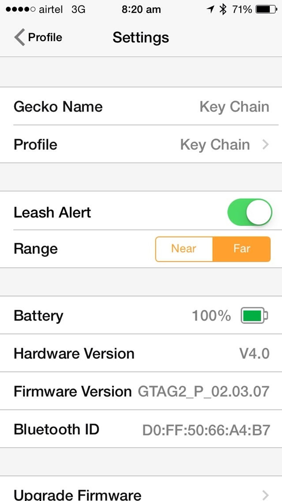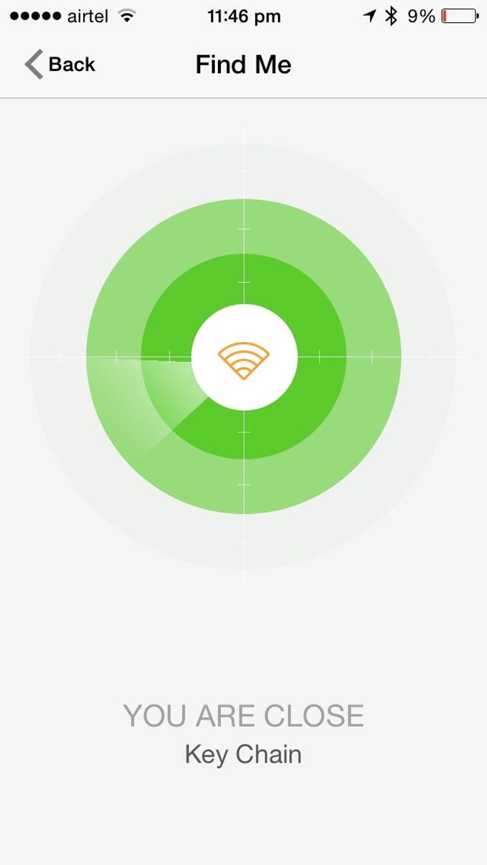 You can see that the Radar indicates how far is your gecko based on the signal strength which could indicate the distance from phone to the tag. tap in the Center, gecko will blink and beep again.