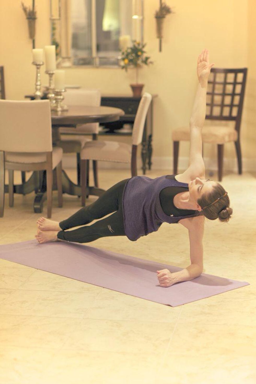 Three Way Plank Part II: rotate to the left arm with right arm straight up. Hold for 20 seconds, then complete on the left side. Complete two sets of front, right, and left rotation. Hold each 20 sec