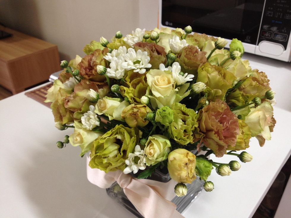 꽃을 준비합니다. 순서대로 소국화, 장미, 리시얀셔스, 종류가 많을 필요는 없어요.돔 형태를 잡습니다.사이사이에 리시안셔스를 꽂아주세요. 빈티지한 암바메론 컬러가 특이하죠?거의 다 했어요. 오늘도 꽃이 넘쳐요. 저 뒤에 또 한움큼 남았어요.빈 공간에 소국화를 꽂아주세요. 꽃봉우리가 아주 야무져요.완성 :) 오렌지색 포인트가 있으면 좋았을텐데 맘에 드는 꽃이 없었어요. 아쉽지만 다음 기회에 ... 이제 놀러가야지;;