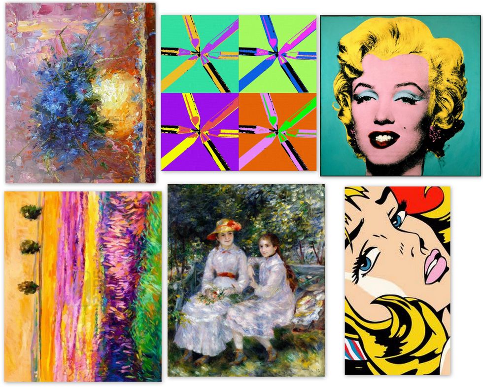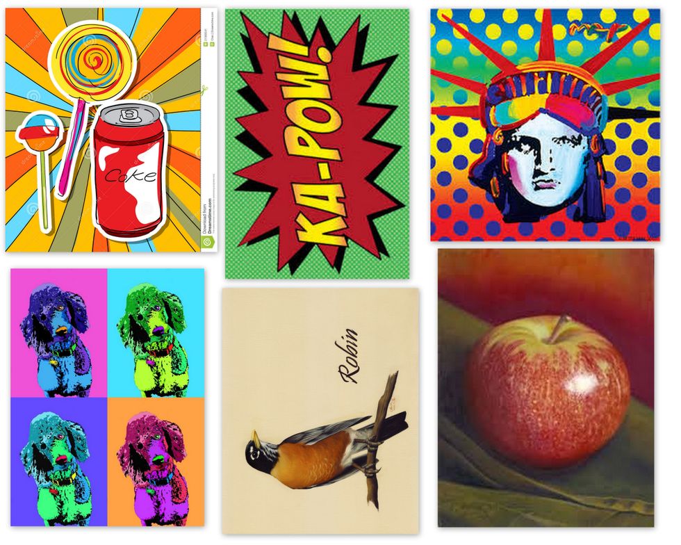 Pop Art (cartoonish) Exs: Warhol, Katz, Lichtenstein