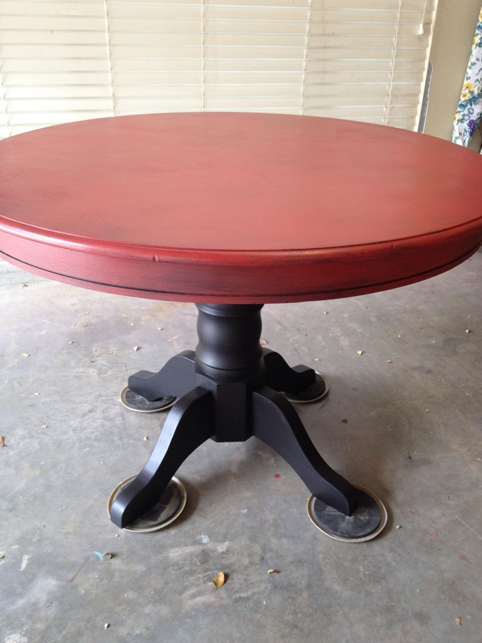 Next I painted the top with black chalk paint (not chalkboard). I did this to give dimension to the paint. I would have just dark waxed over red, but this table will be used daily.