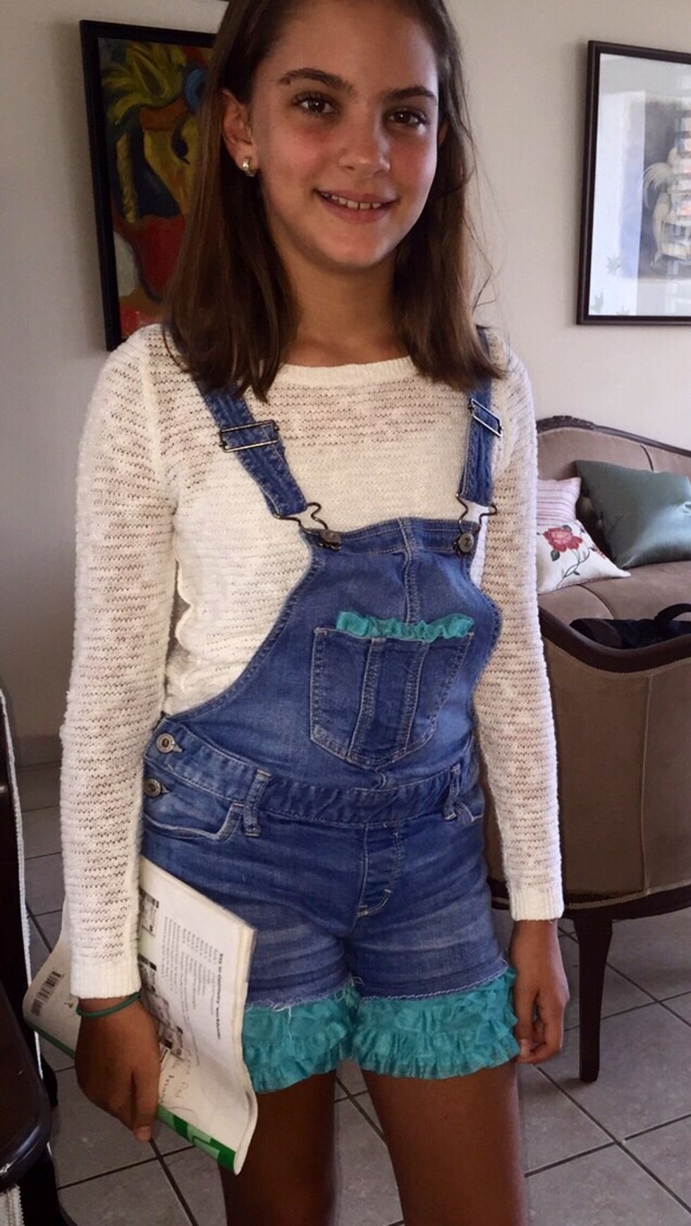 The old dress had some tulle rosettes and we decided to embellish the overalls to make a new style! You can hand stitch these details!