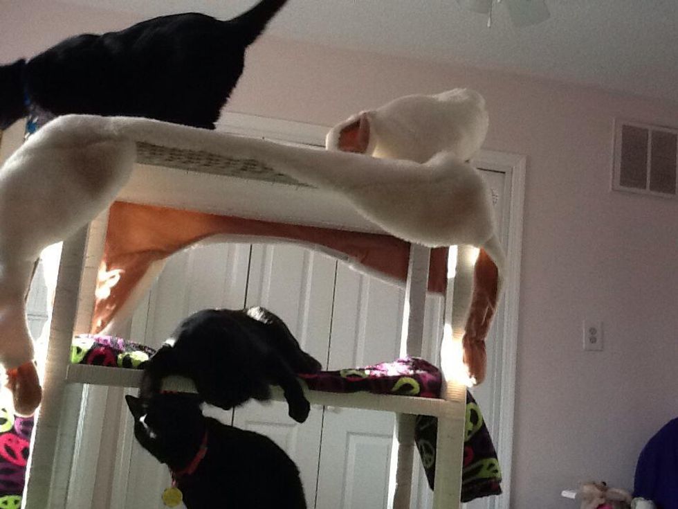 Then, take your blankets and put them on the shelves. If you have more shelves then your number of cats, you can use the extra shelves for books and stuff! Now, Take your cat and put them on it.