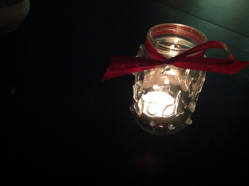 Du behöver en ren och torr glasburk. Värm igång limpistolen och se till att ha extra patroner! Oj då! Det här blev kanske inte jättefint, men du kan ju göra det mycket finare :-) Kanske fina snöstjärnor på!? Tänd ett ljus och mys!