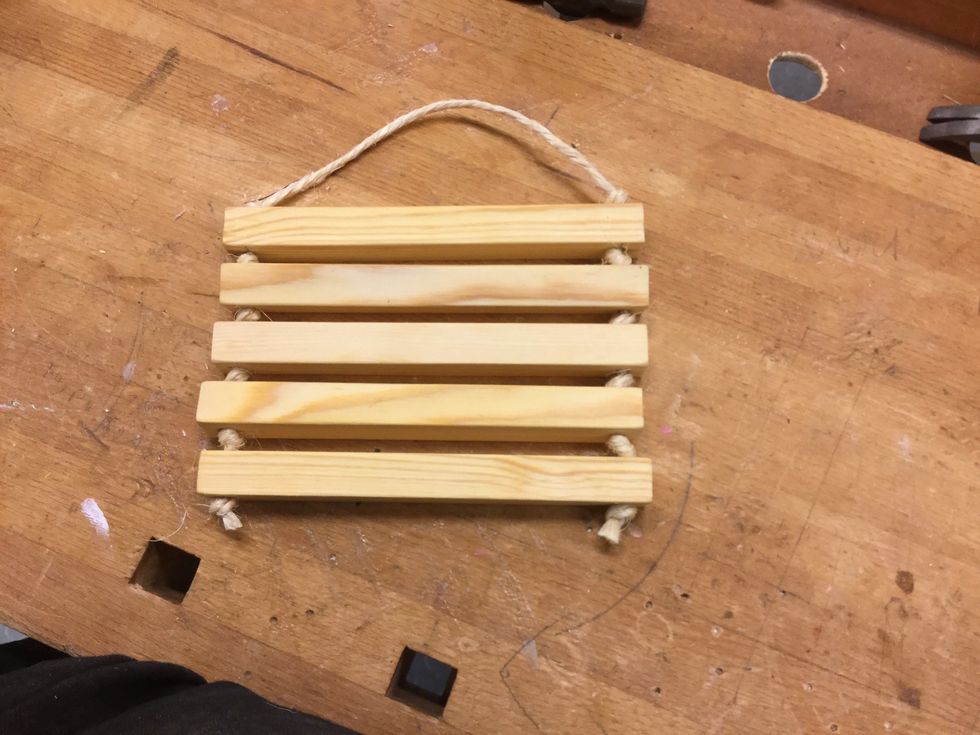 Fortsätt tills du har trätt på alla pinnarna och knutit emellan. Knyt en knyt längst upp också.