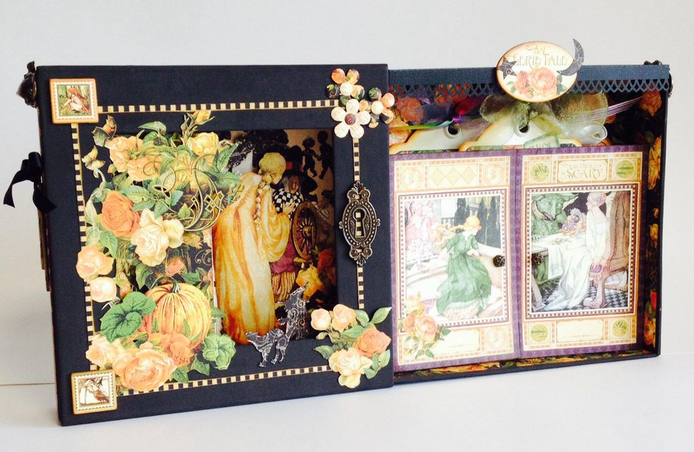 Paste inside with Graphic45 An Eerie Tale12'paper pad as shown Cut a black paper(any) sized 2 1/2'x8 1/2' and paste just edge of wall Past with Graphic45 An Eerie Tale12'paper shown