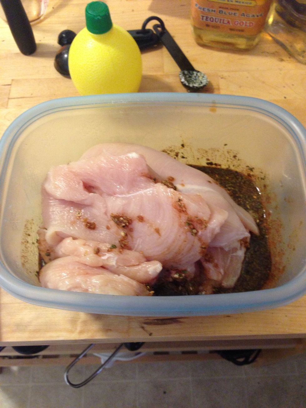 Now stir the chicken thoroughly in the mixture. I always use a container to shake it up. Ziplock baggies also work.