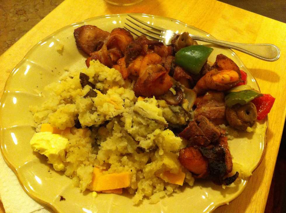 Start making your kabobs (meat, bacon wrapped shrimp and veggies.