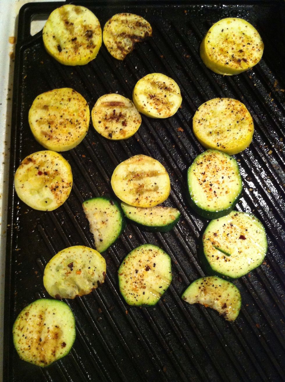 On medium heat spray grill pan with cooking spray and place zucchini and squash on to heated pan.