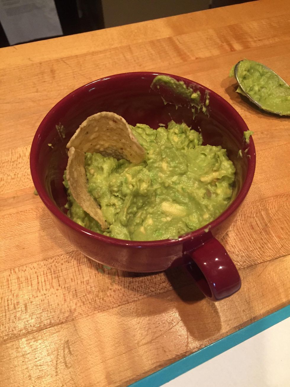 Remove pit, cut up one avocadoAdd 1 tsp of lime juiceAdd 1/2 tsp course saltAdd 1/2 tsp of garlicMash everything together until smoothEat with chips
