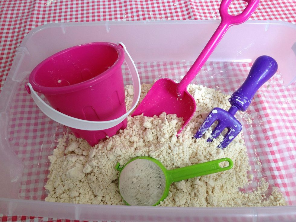 Vierte la harina y el aceite en el recipiente plásticoConsigue cubetas, palas y cualquier utensilio que lo haga más divertidoA jugar!!
