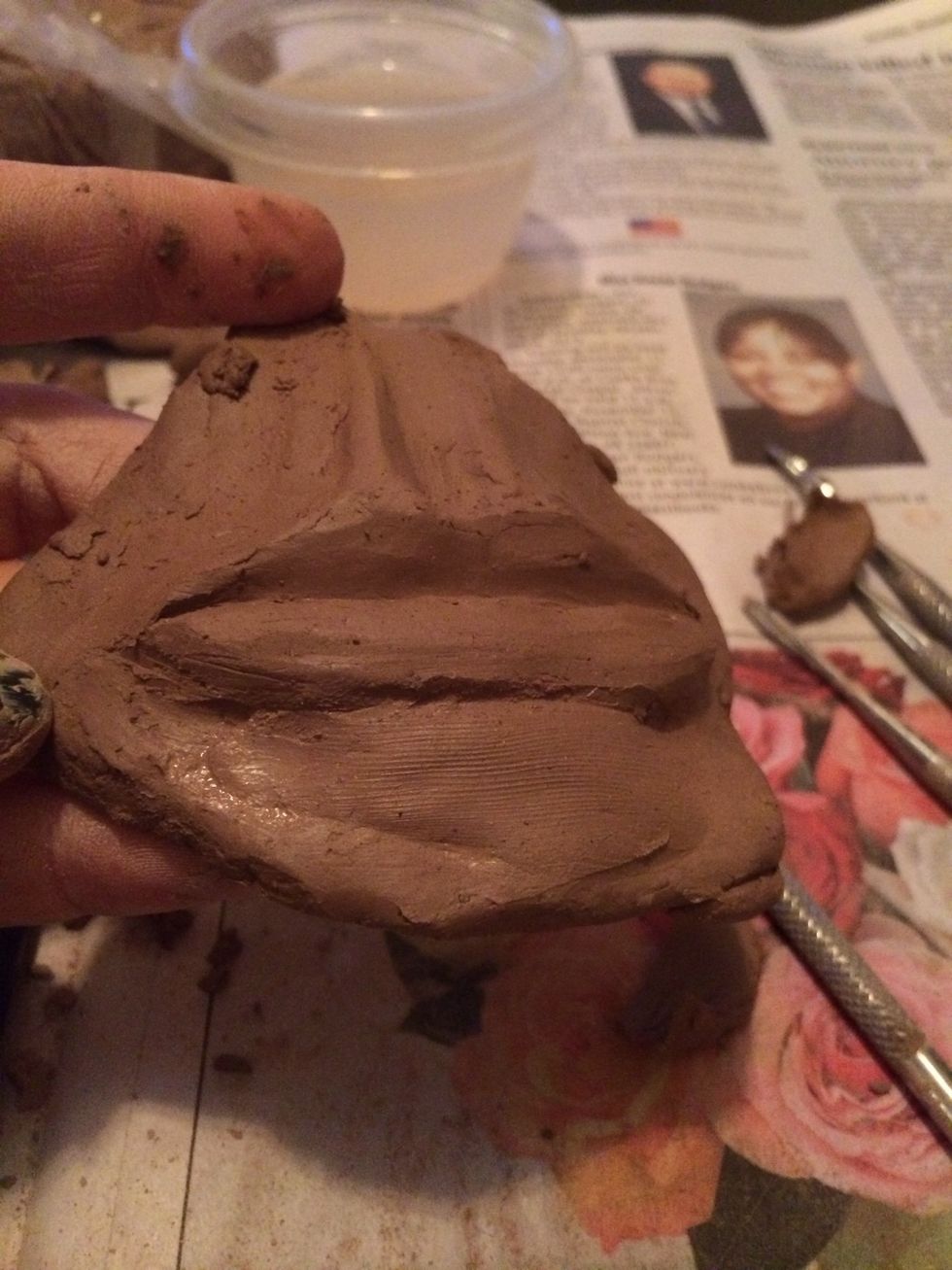Mouth. When starting the mouth make 2 coils, one slightly thinner. Flatten the coils just a little before you add them to your clay surface. Score and slip before adding.