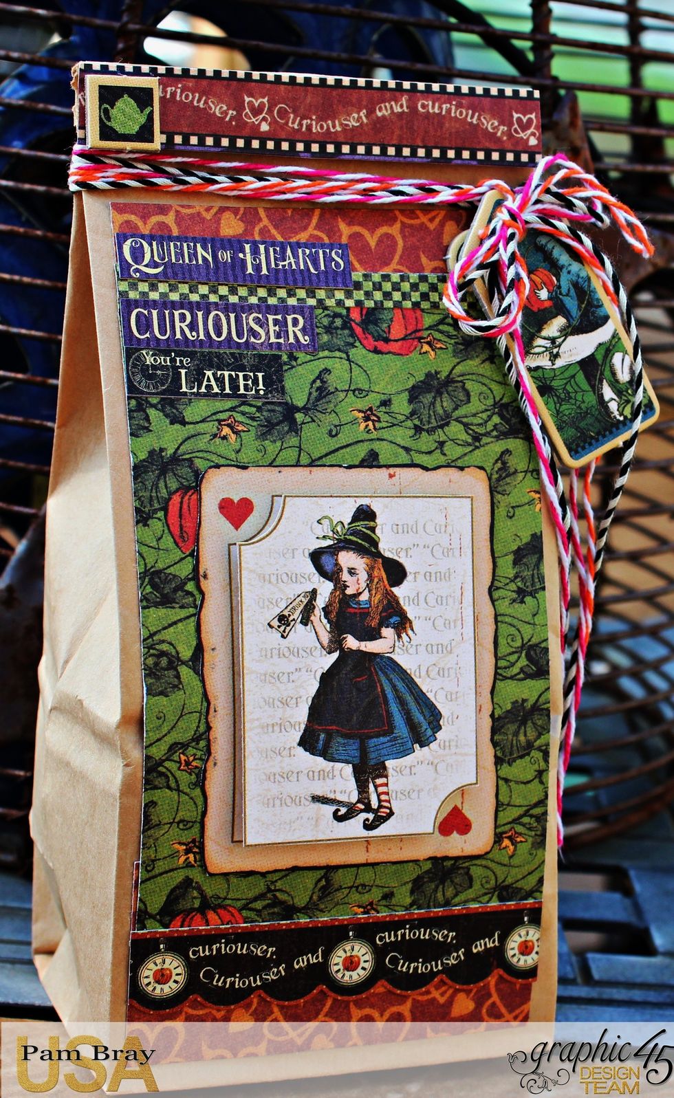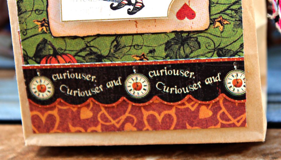 Fussy cut two card images from pattern paper. Adhere to front one to front of treat bag and the second place on with pop dots.