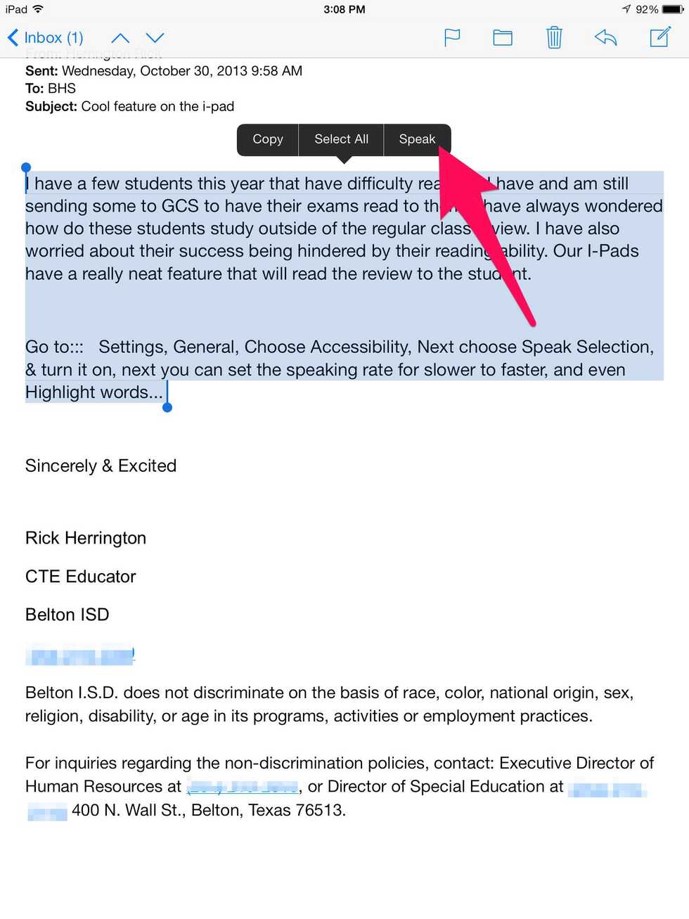 By turning on Speak Selection, your iPad can read any selectable text to you.