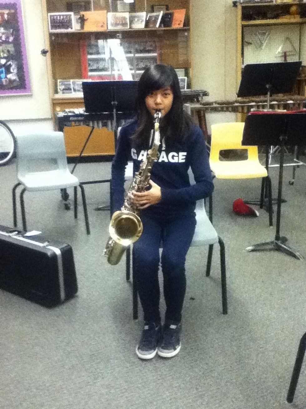 How to sit with your sax. Let the sax. sling to your right side. Make sure your feet are flat on the floor. Sit up straight so that you'll produce a good tone and DO NOT lean on the back of the chair.
