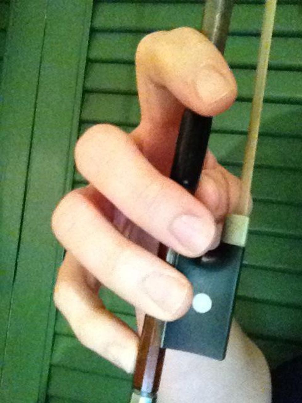 Your bow grip should look like this from the other side. Remember to relax the death grip of your thumb and keep your pinky curved.