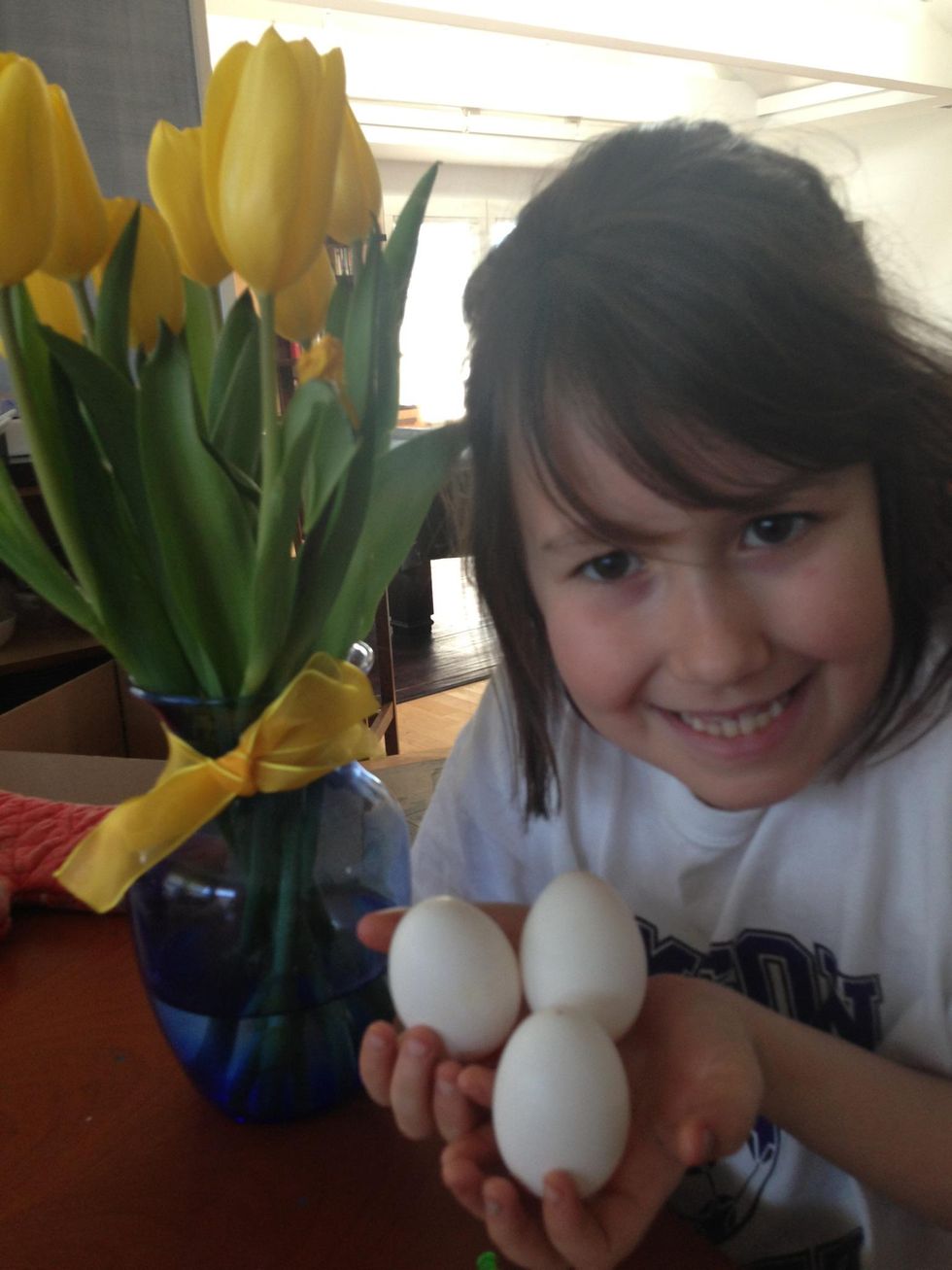 Now blow through the smaller hole. The egg will slowly come out the larger hole. Be careful not to squeeze the egg as you blow or it will break.