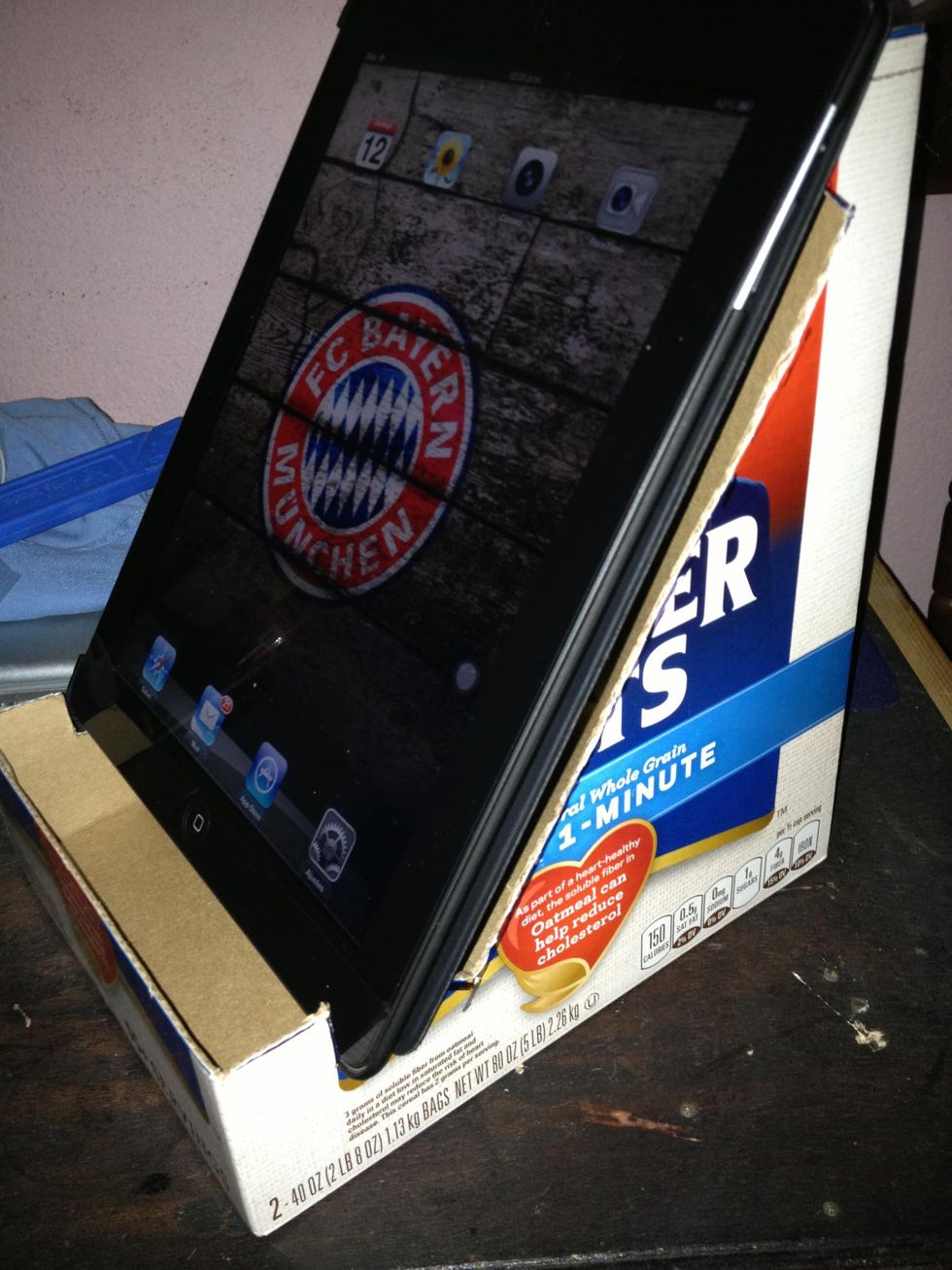 Place your iPad on the wider side of the box. Mark the space to place your iPad vertically and horizontallyCut both sides as shown in the picture...and ready! I hope you like it, I apologize for my English, blessings