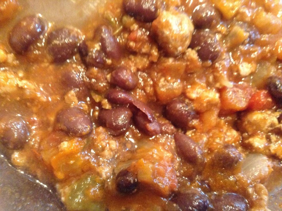 Brown Onion + Minced Garlic in olive oil and Add ground turkey or beef + Chilli 9000 Seasoning