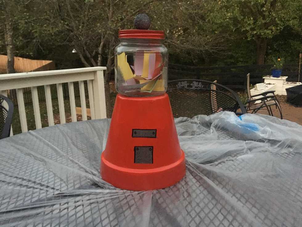 Get all your materials including a flower pot, red spray paint, black Sharpie, silver spray paint, a pencil, a foam ball, a big jar with a lid on it, and different color paper.