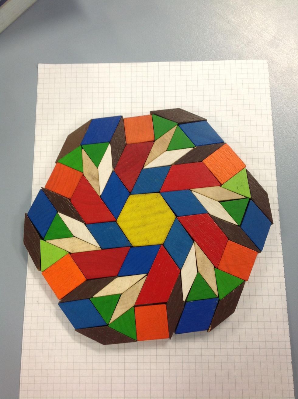 Step 2: Put main shape down in the centre. Tesselate shape by placing a specific colur and shape around the central shape.