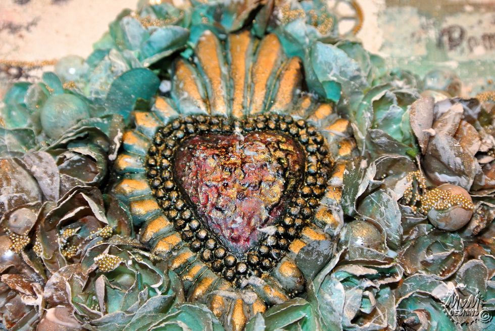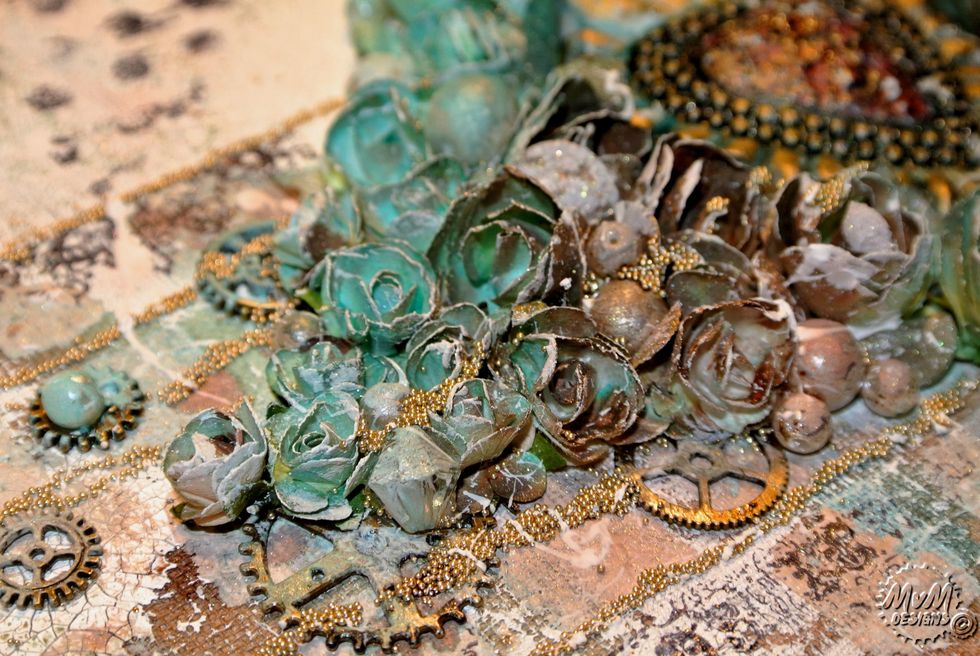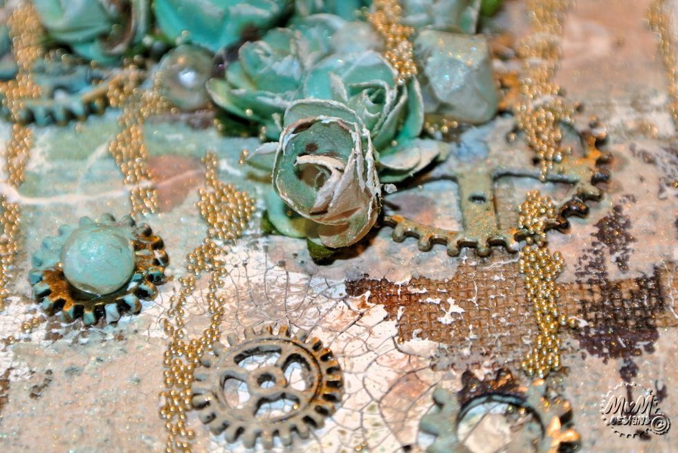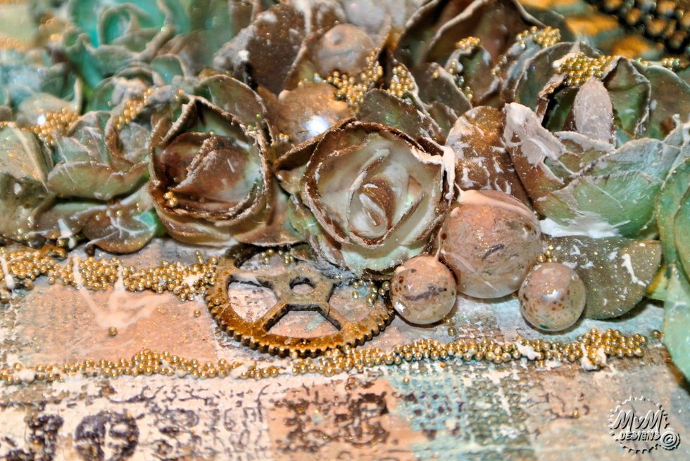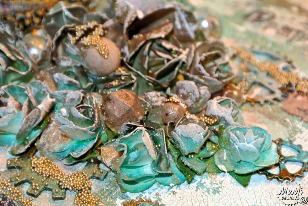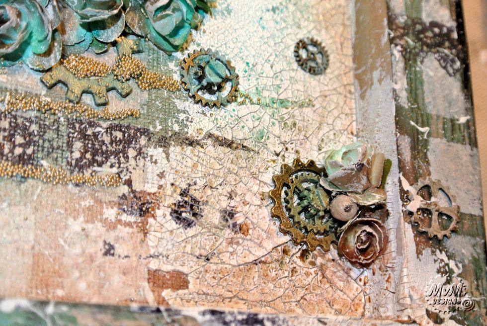 Spray everything with the Minx mixes (mix blue/green/yellow and mis brown/gold/yellow) and spray the embellishments.
