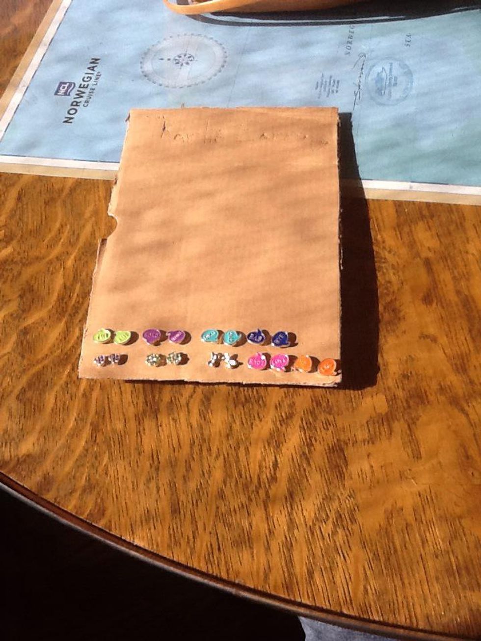 Push the pin or needle you are using through the piece of cardboard you just cut out. Do that again right next to the hole you just made to create holes for your pair of earrings.