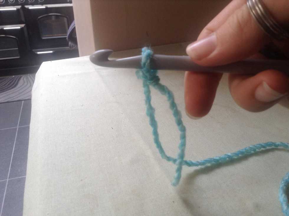 To start doing chains: put wool from right hand over the hook from far away from you to this side of the hook
