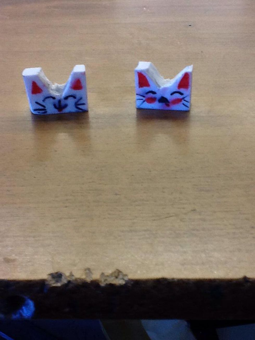 Gather your supplies: scissors, a plain white eraser, and markers.Cut your eraser in halfThis will make for two cat erasers.Cut along these linesThey should look like thisAdd a cute face!Don't forget the tail!Now you have 2 cute cats!!!