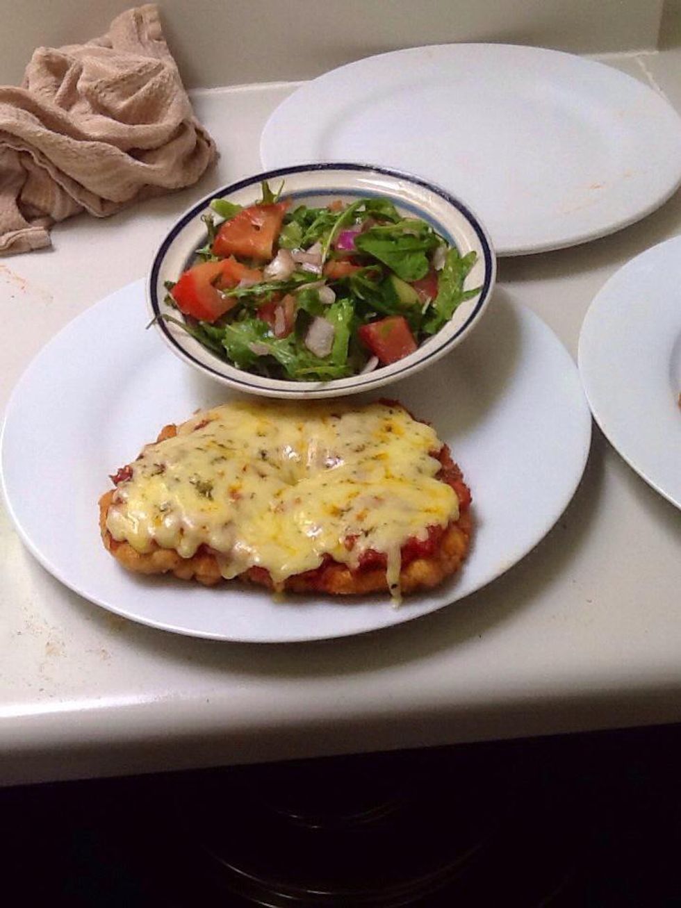 Once the chicken is fried place it on a oiled oven tray. Then spread tomato sauce over the top of the breast followed by grated mozzarella. Then place in a preheated oven at 180 degrees.