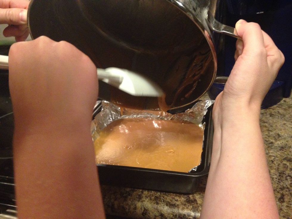 When it gets to 250 f you take it off the stove then you add in the butter,vanilla extract,and salt then stir it then when it's all mixed in you pour it into the pan and let it sit for 2h.