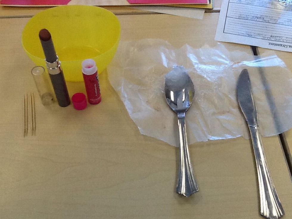 First, take the bowl and the butter knife and cut a little bit of the lipstick and put it into the bowl.