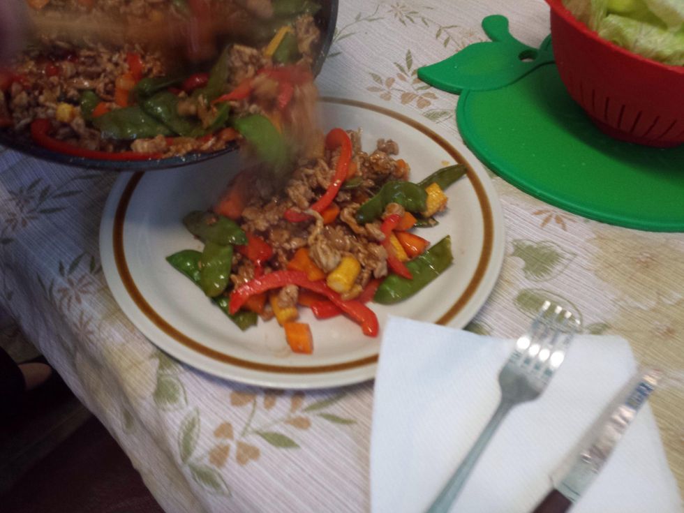 First add in about 150ml if the Hoisin sauce then stir. Then add about 100ml of the sweet chilli sauce then stir.