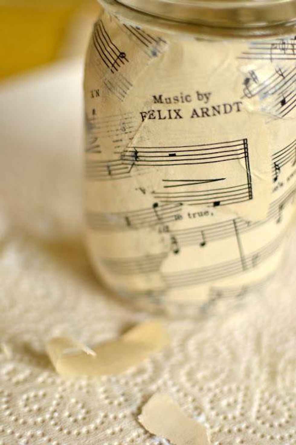 Tips: if you don't have news paper why not use music paper it looks nice in this pic:)). If you want the paper to stay on and not peel off put an other layer of glue on it before leaving it to dry:)