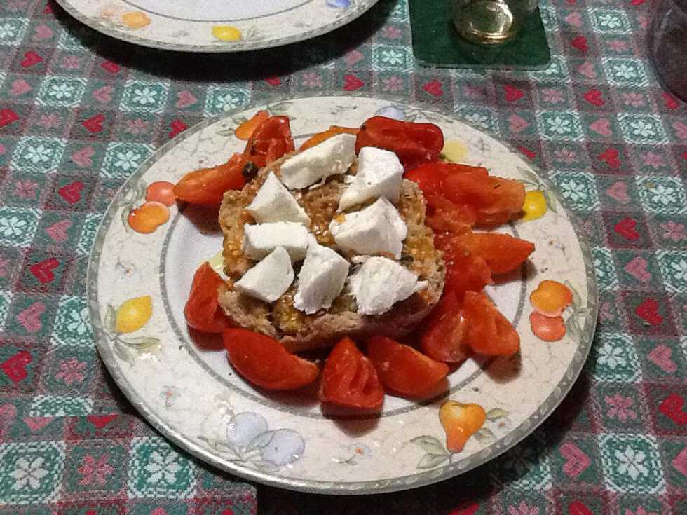 Strain the frisella, put it on a plate and add the tomatoes. Squeeze some tomato juice on top of it.