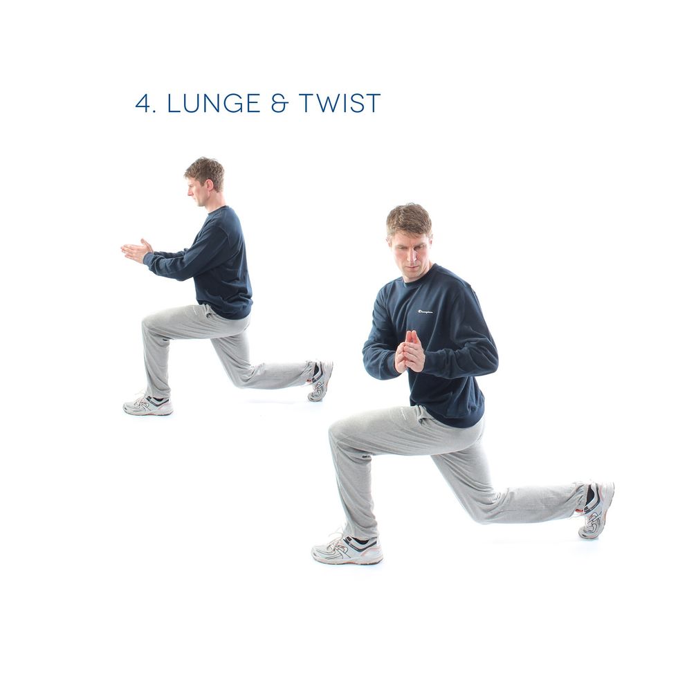 Lunge & Twist - Step forward bringing your knee to the floor.With your hands together, rotate your upper body to the side then return. Do 20 on each side
