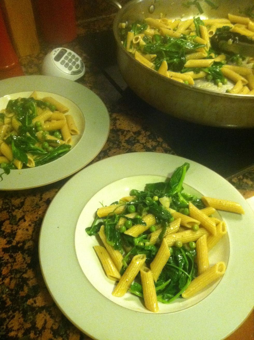 Throw the pasta and peas into the sauté pan and cook in the remaining liquid until it's mostly absorbed and the pasta is cooked to your liking. I like mine al dente.
