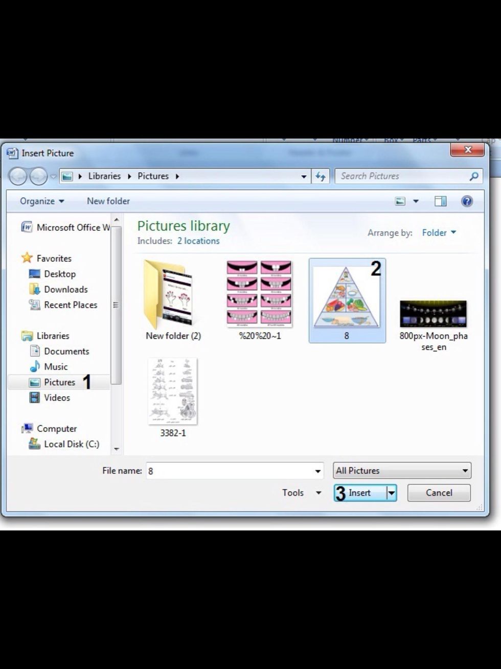 (١) حدد مكان الصوره (٢) حدد الصوره المراد ادراجها (٣) اضغط على insert لادراج الصوره