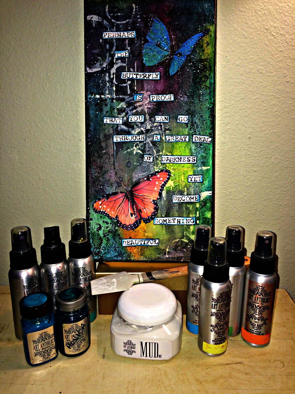 I glued my butterflies in place then I dumped some of the white ink onto my craft mat. Using a toothbrush I did a splatter of white ink onto the canvas and butterflies. I like a grungy look..